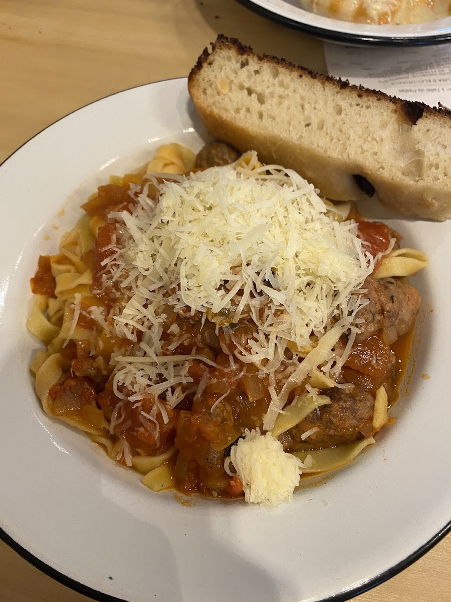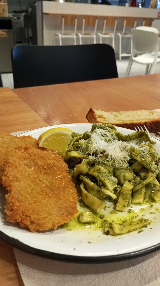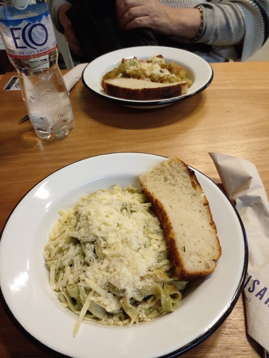 Muy Rico Menu de pastas dentro de un mercado (Merkat). Pastas sabrosas con pan de masamadre. Pobre unos noquis de rucula y mi novia unas pastas de espinaca con albongidas. Platos rodeando los 3500 pesos. Abudante queso rayado y pan de masamadre para acompñar la salsa.